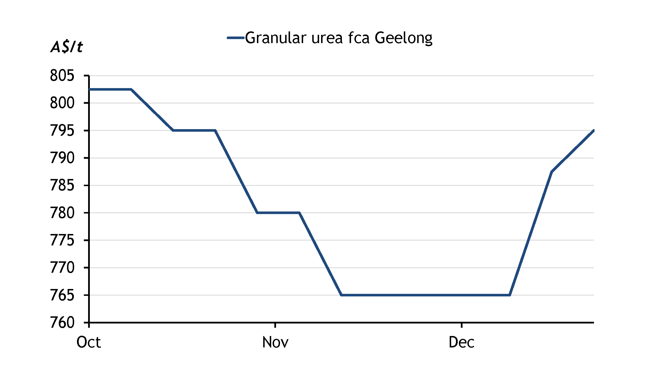 Granular urea was last assessed at A$790-800/t fca Geelong.