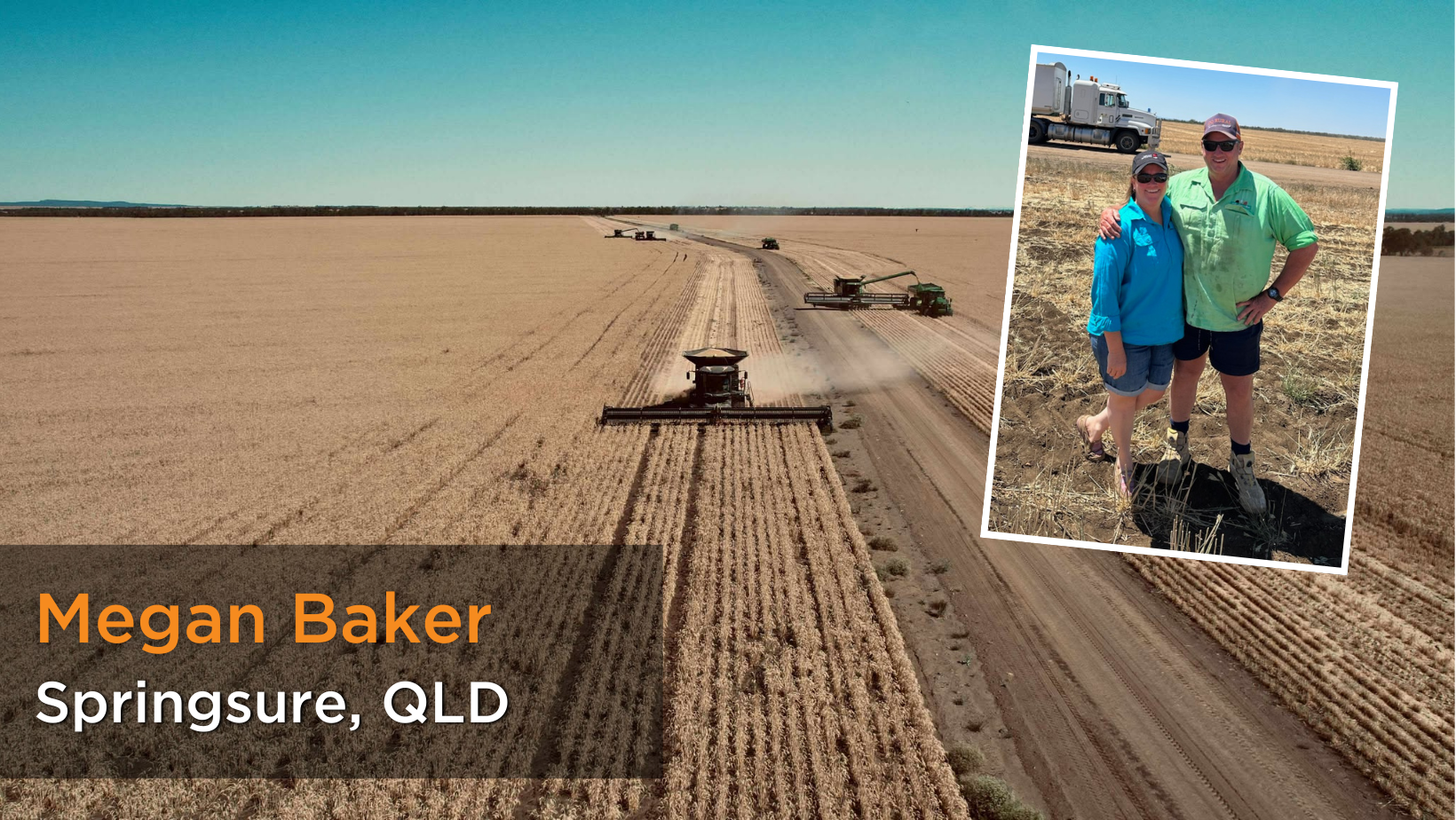 Hi, I’m Megan Baker, and I farm with my husband Mark, a third-generation farmer, about halfway between Springsure and Rolleston in the Central Queensland Highlands. Our farm covers around 8,600 hectares, where we grow everything from chickpeas to wheat.