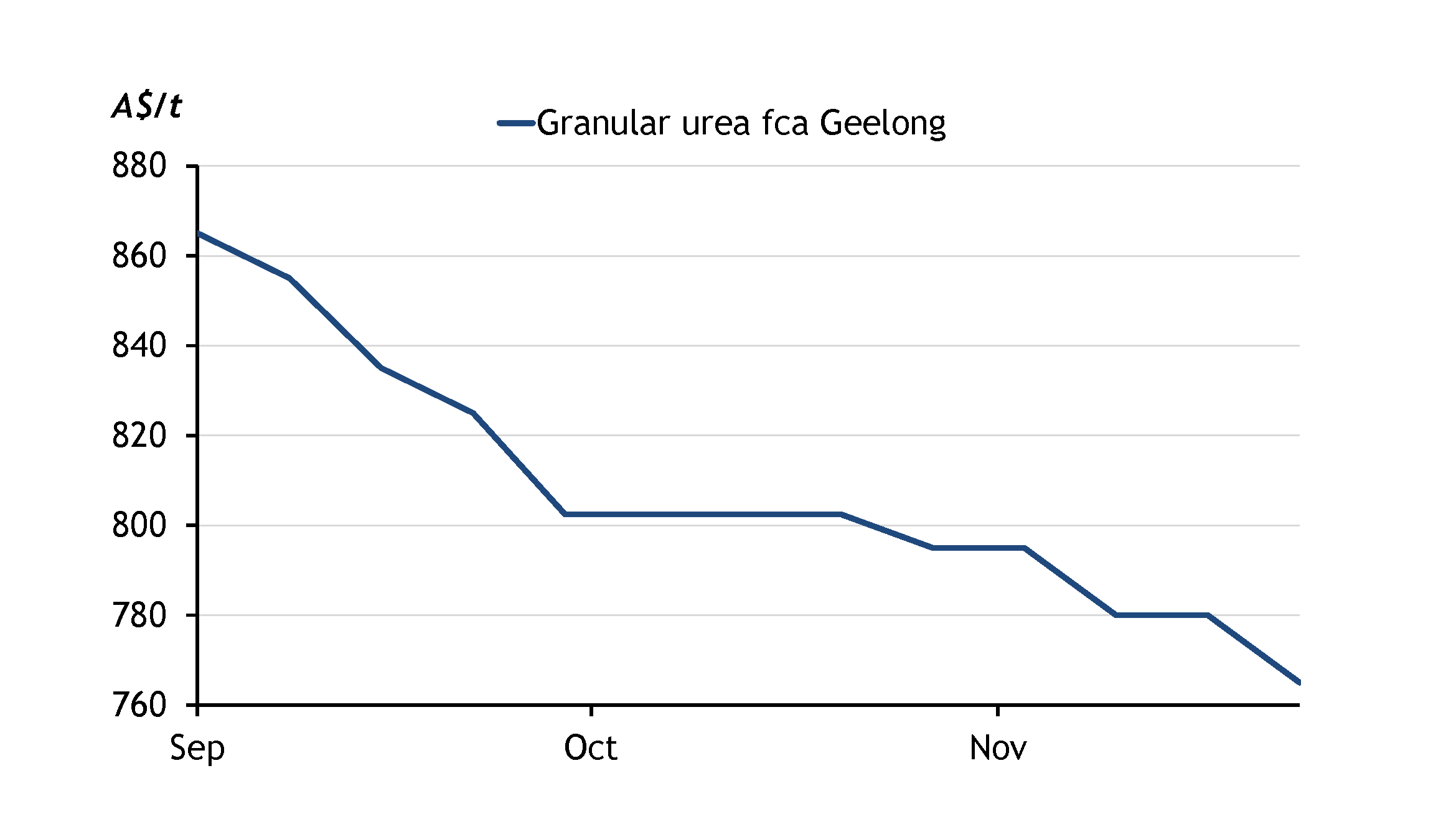 Granular urea was last assessed at A$760-770/t fca Geelong.