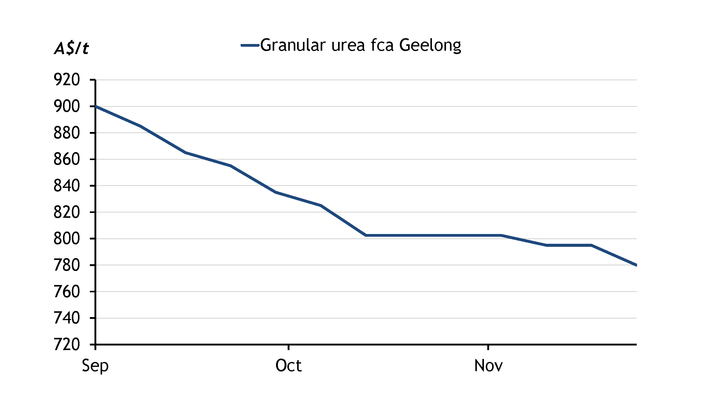 Argus last assessed granular urea at A$770-790/t fca Geelong because of continued low demand.